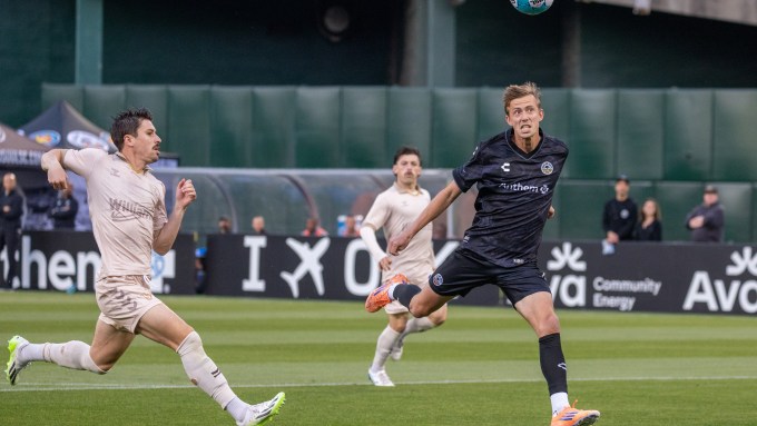Oakland Roots forward Wolfgang Prentice heads the ball for a goal against FC Tulsa during the first half of a USL Championship match, Saturday, April 18, 2026, at the Oakland Coliseum in Oakland, Calif. (Bridget… More