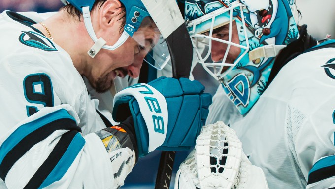 San Jose Sharks Dimitry Orlov (9) congratulates goaltender Alex Nedeljkovic (33) after defeating the Winnipeg Jets at the Canada Life Centre in Winnipeg on Thu Apr 16, 2026 (San Jose Sharks X photo)