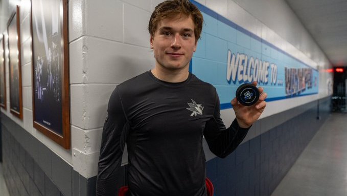 San Jose Sharks Macklin Celebrini broke the Sharks all time points record with 115 passing Shark great Joe Thornton against the Winnipeg Jets at the Canadian Life Centre in Winnipeg on Thu Apr 16, 2026 (San Jose Sharks X photo)