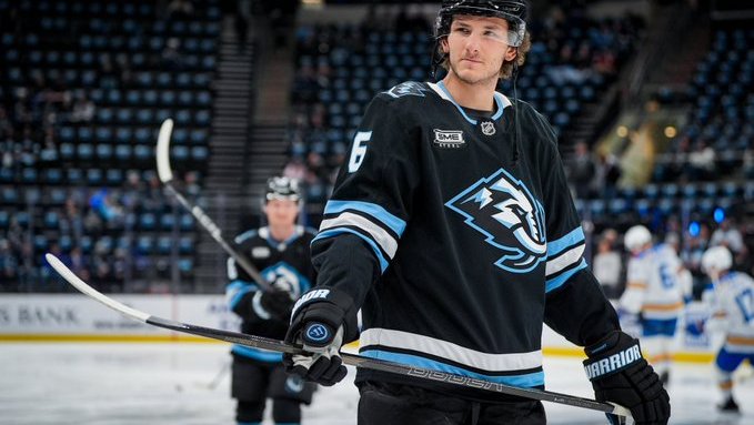 Utah Mammoth John Marino takes in the warm up before their game against the St Louis Blues Thu Apr 3, at the Delta Center in Salt Lake City (Utah Mammoth X photo)
