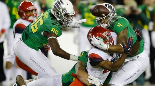 Starting yet another drive in Arizona territory, the Ducks took the ball to the Wildcats’ 7 before Mariota beat an Arizona defender to the corner of the end zone to give Oregon a 13-0 lead.
