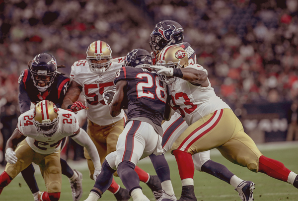 After the safety, head coach Jim Tomsula made a point to console and encourage Thompson on the sidelines, but the 6’3” quarterback didn’t see things get much better. Twice after brief 49ers’ possessions under Thompson, the Texans ran double-digit plays but settled for a pair of 41-yard Reggie Bullock field goals.