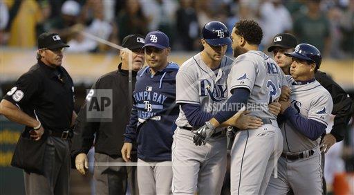 The A’s seemed to get an unlikely boost from home plate umpire Paul Nauert’s ejection of James Loney, who threw his helmet in disgust when he looked at strike three to end the top of the sixth. The A’s responded with their pair of home runs of starter Erasmo Ramirez to take the lead less than 10 pitches after the ejection.