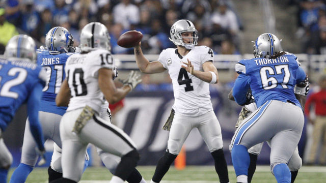 photo credit: USA Today Derek Carr drops back from the Detroit defense sun nov 22nd