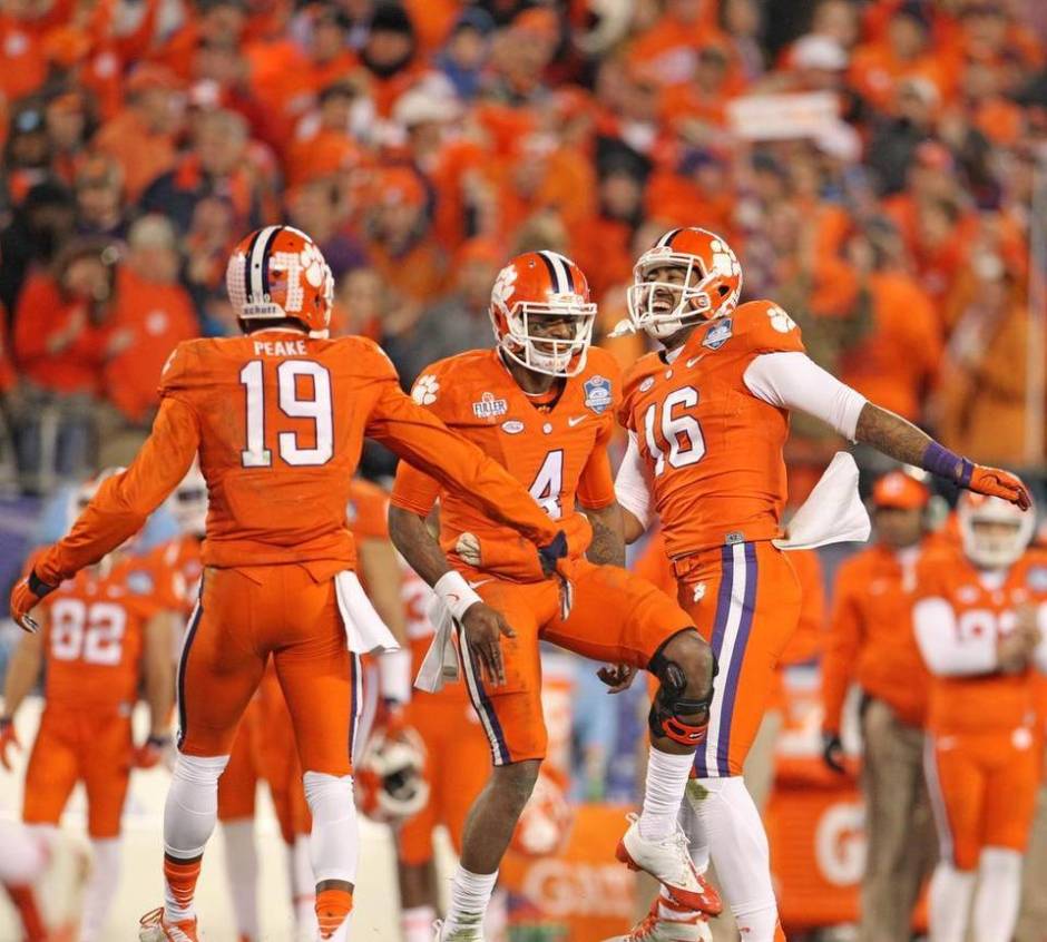 photo credit: gmelendez@thestate.com of Clemson’s Jordan Leggett (16), DeShaun Watson (4), Charone Peake (19) celebrating win over NC