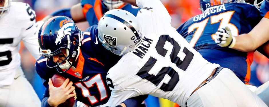 Mack picked up five sacks in the second half including one in the end zone for a safety as the a Raiders came back from a 12-0 halftime deficit to defeat the Denver Broncos 15-12 at Sports Authority Field at Mile High.