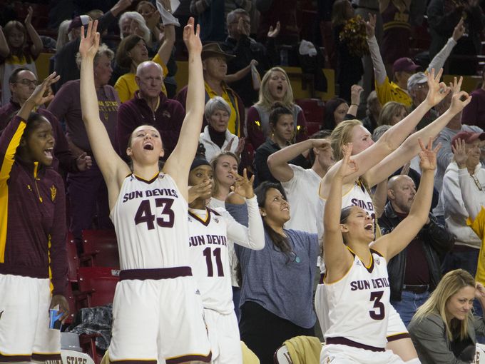 photo credit: azcentralsports.com ASU bench celebrates after ASU’s Elisha Davis buries a three pointer in third quarter