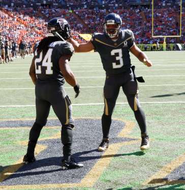 photo credit: Marco Garcia AP Atlanta Falcons running back Davonta Freeman scores touchdown and is congratulated by Seattle Seahawks quarterback and game MVP Russell Wilson