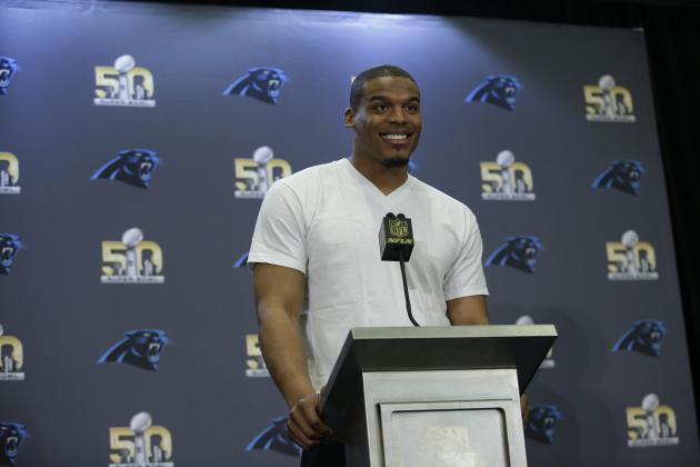 AP Photo: Carolina Panthers quarterback Cam Newton addressing the media on media day Monday at Super Bowl 50