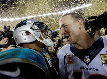 AP photo: Panthers quarterback Cam Newton and Broncos quarterback Peyton Manning talk after Super Bowl 50
