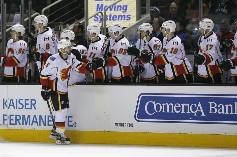 AP photo Calgary’s defenceman Mark Giordano does the victory lap at the Flames bench after scoring a first period goal against the Sharks on Thursday night