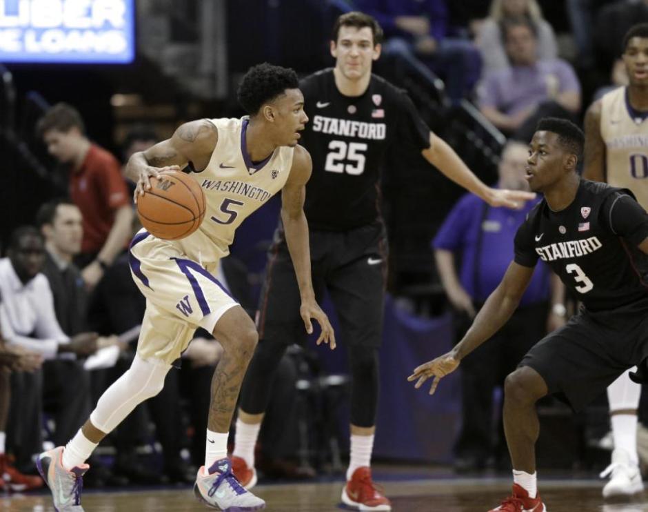 AP photos: The Washington Huskies Dejounte Murray (5) drives against the Stanford Cardinals Rosco Allen (25) center and Marcus Allen (3) right Saturday night in Seattle, Murray led the Huskies in scoring with 25 points