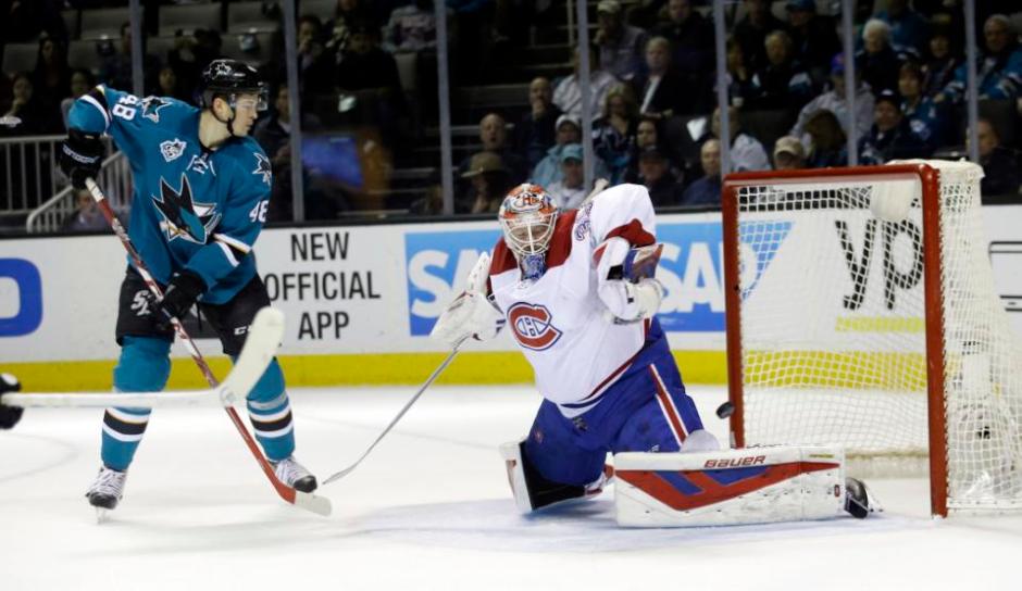 AP photo: San Jose Sharks Joe Pavelski beats Montreal Canadiens goalie Mike Condon for a goal in the first period on Monday night at SAP Center