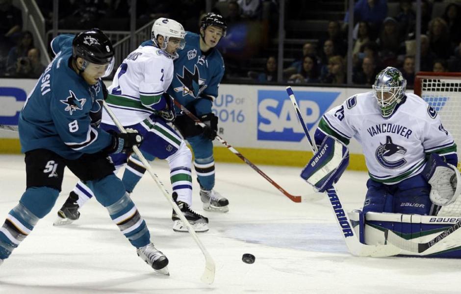 AP photo: San Jose Sharks Joe Pavelski takes a shot against Vancouver Canucks goalie Jacob Markstrom Saturday night