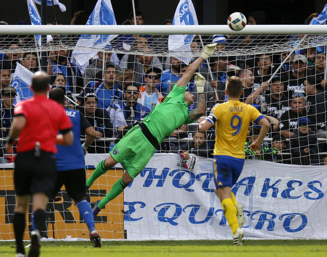 photo credit: San Jose Mercury News–San Jose Earthquakes David Bingham (1) makes a save against the Colorado Rapids Sunday