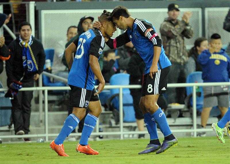 photo credit: squawka.com–San Jose Earthquakes Quincy Amarikwa is congratulated after scoring the Quakes second goal on Sunday at Avaya Stadium