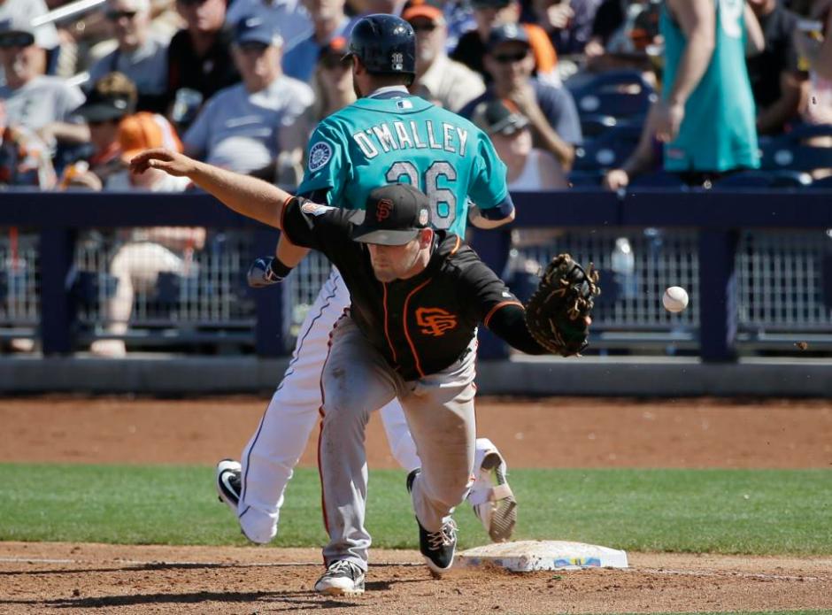 AP photo: Seattle Mariners Shawn O’Malley is safe at first as San Francisco Giant first baseman Conner Gillaspie stretches missing the throw from third baseman Kelby Tomlinson in the third inning of Wednesday’s exhibition game