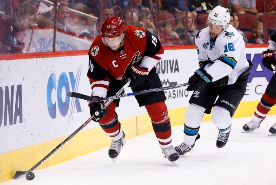 AP photo: Coyotes Shane Doan (19) tries to outskate the Sharks Nick Spaling (16) with the puck, Doan ended up scoring the go ahead goal on Thursday night