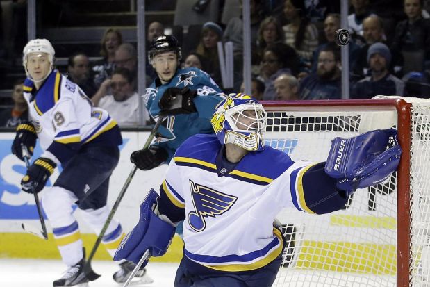 AP photo: St Louis Blues goaltender Brian Elliott juggles with the puck as Elliott and the Blues throw a 1-0 shutout against the Sharks on Tuesday night