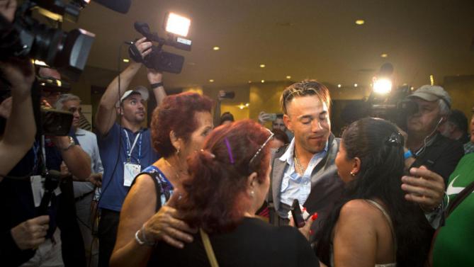 photo credit: news.yahoo,com–Cuban born Tampa Bay Rays outfielder Dayron Varona is greeted by family and friends