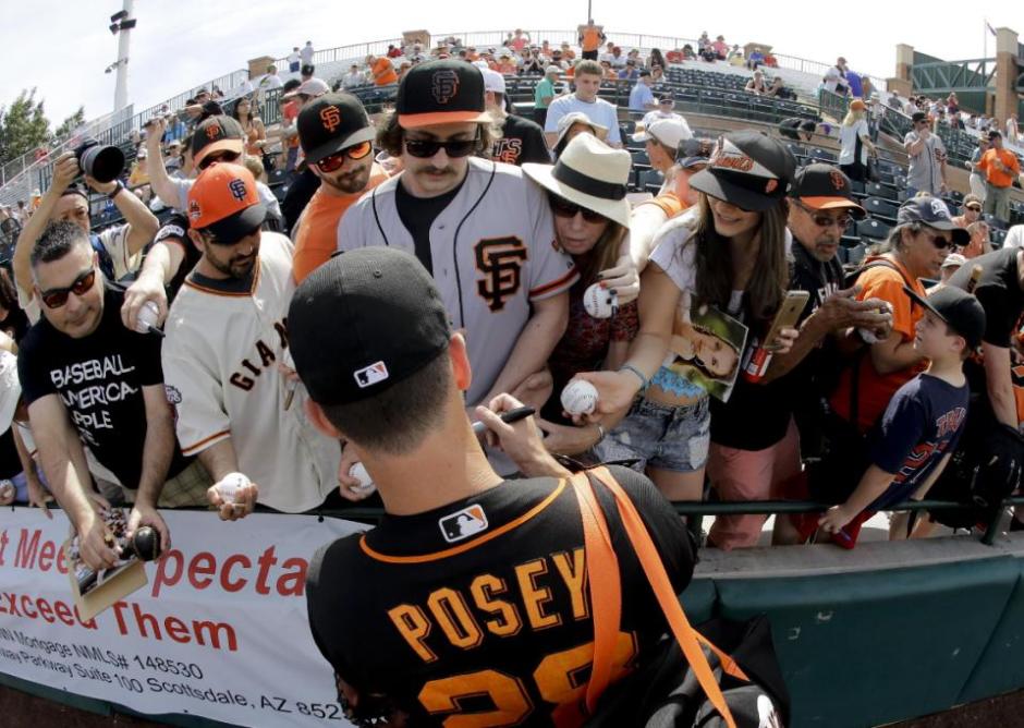 AP photo: San Francisco Giant catcher Buster Posey stops to sign autographs for the fans at Scottsdale Stadium on Wednesday March 2 before they meet the LA Angels