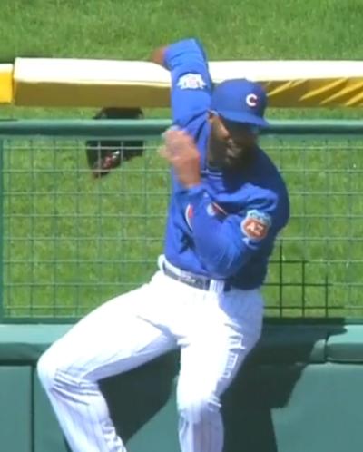 photo credit: MLB.com screen grab–The Chicago Cubs Jason Heyward hops the fence to avoid a swarm of bees after getting stung ten times he later hit a homer in the game