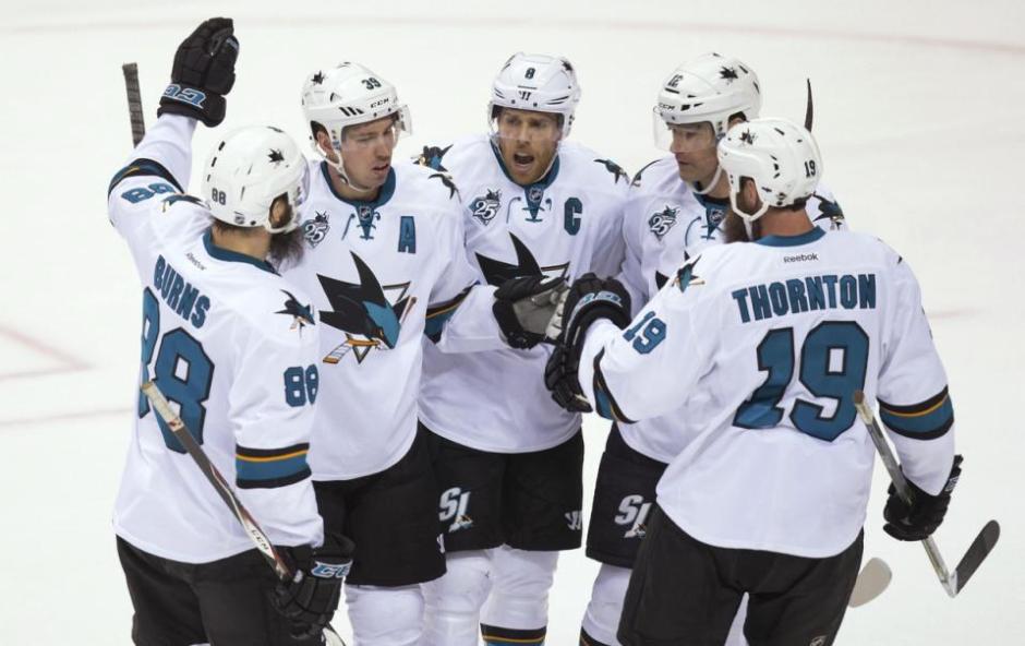 AP photo: The San Jose Sharks Logan Couture (A) is congratulated for his third period goal by teammates from left Brent Burns, Couture, Joe Pavelski, Patrick Marleau and Joe Thornton at Rogers Centre in Vancouver