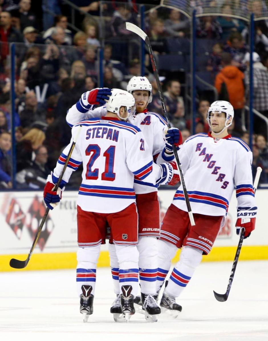 AP photo the New York Rangers Derek Stepan (21) is congratulated by Marc Staal (center), and Dan Girardi (right)
