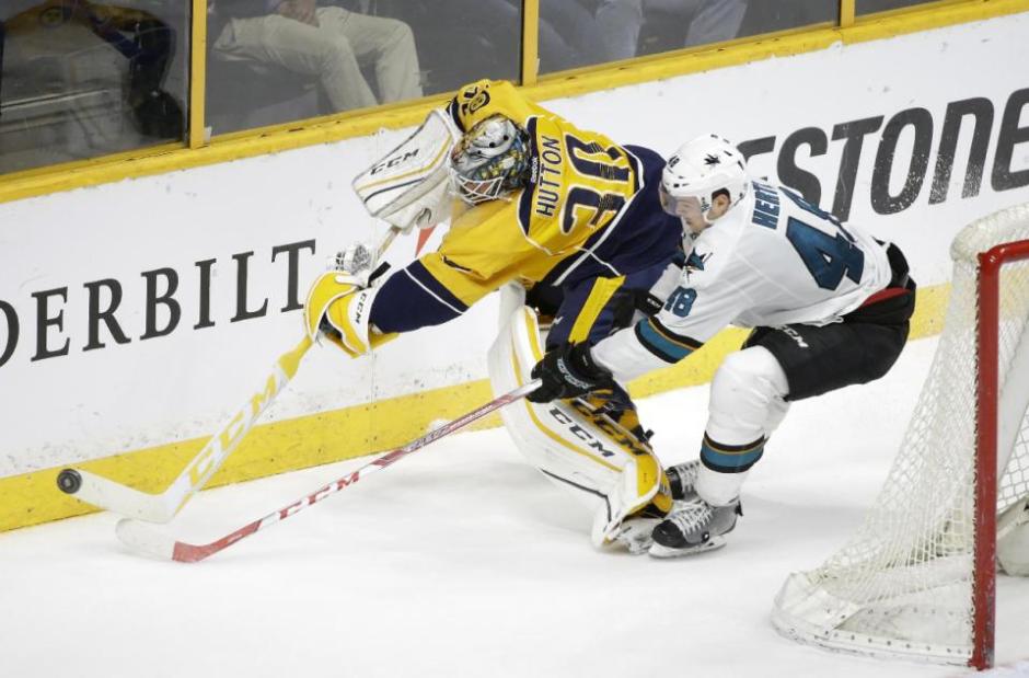 AP photo: The San Jose Sharks Tomas Hertl (48) goes for the puck behind the net as the Nashville Predators goalie Carter Hutton (30) tries to control the puck along the boards last Saturday at Nashville