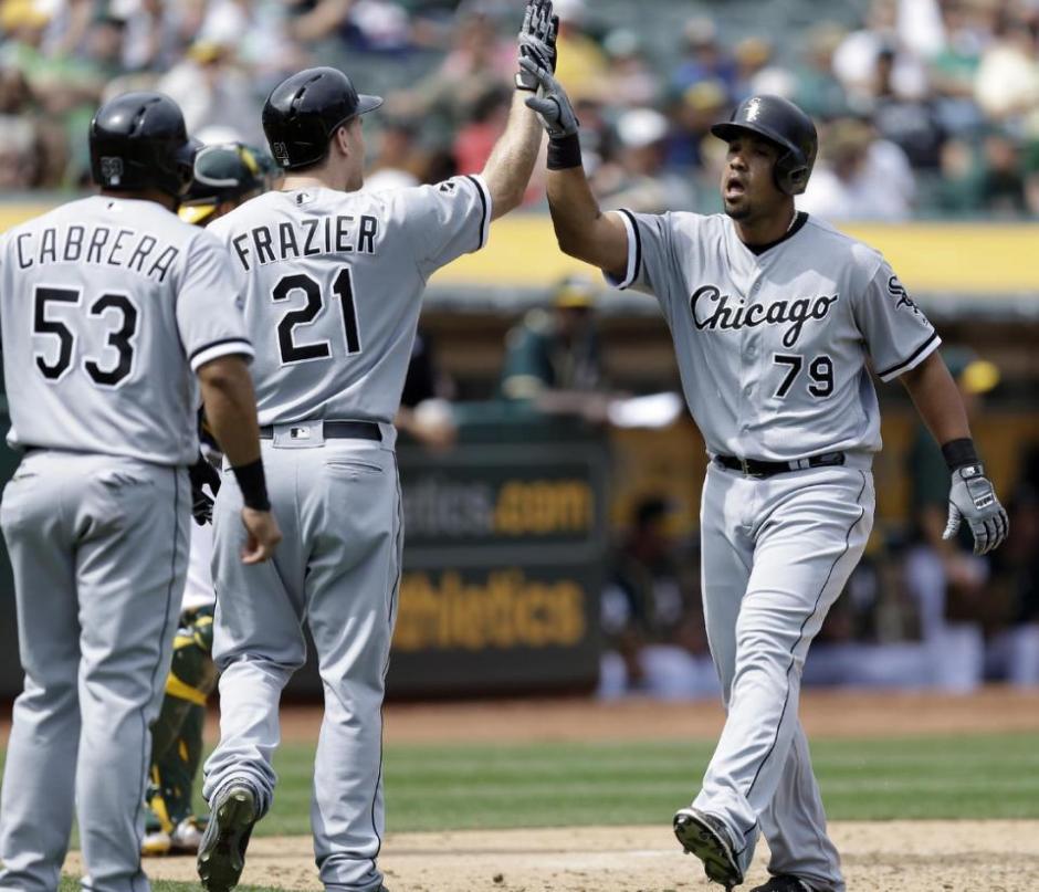 front page photo AP: The Chicago White Sox Jose Abreu hit a sixth inning home run off Oakland A’s starter Kendall Graveman is congratulated by teammates Todd Fraiser (21) and Melky Cabrera (53)