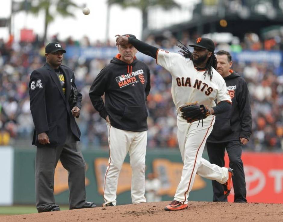 AP photo: San Francisco Giants pitcher Johnny Cueto gets the once over to see if he’s feeling ok by home plate umpire Alan Porter, Giants manager Bruce Bochy, and team trainer on Sunday at AT&T Park in the first inning