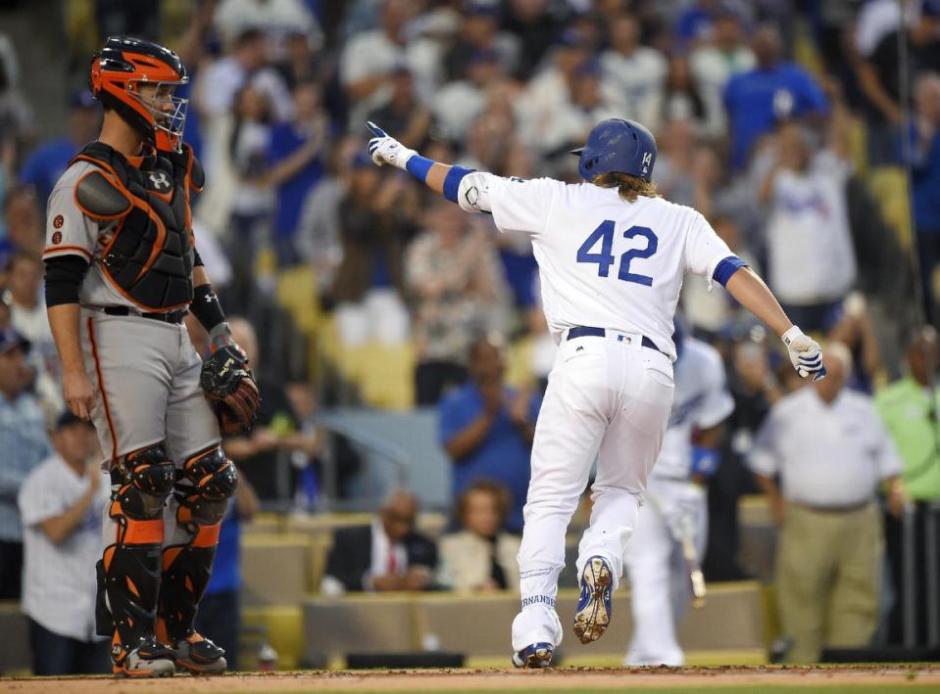 AP photo: Los Angeles Dodger Kike Hernandez points to the crowd at Dodger Stadium after launching a solo shot in the first inning as San Francisco Giant catcher Buster Posey watches on Friday night