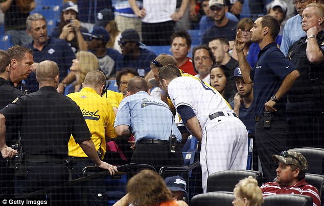 photo credit Daily Mail London: Tampa Bay Rays hitter Steven Souza Jr checks on fan in the stands after a hitting foul liner that hit her in the left side of the face on Friday at Tropicana Field