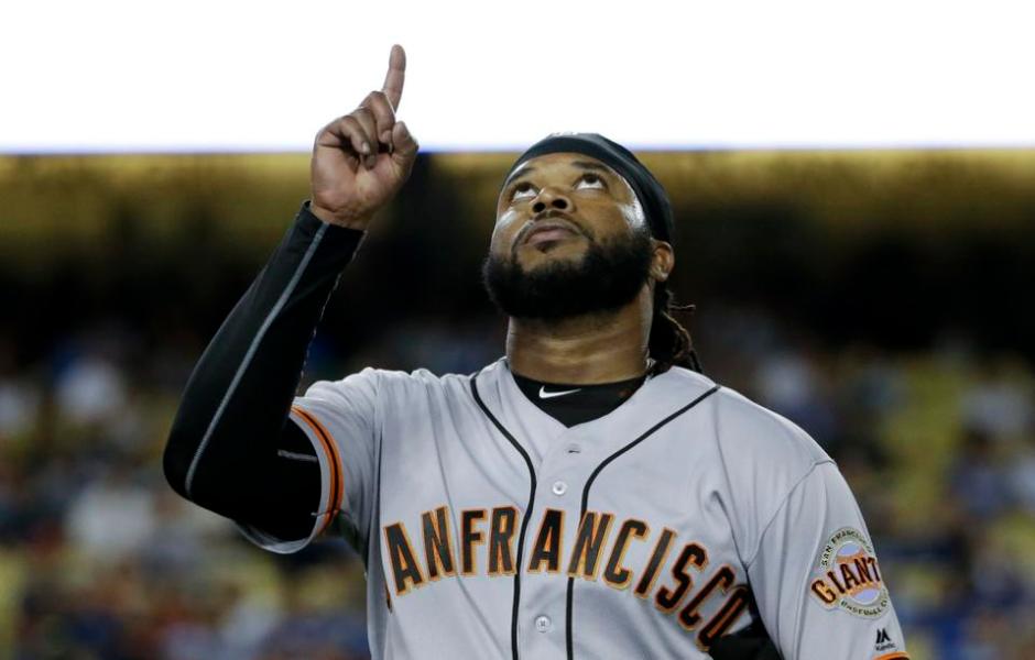 AP photo: San Francisco Giants pitcher Johnny Cueto points to whose guiding him on the mound as he picks up his third win of 2016 against the LA Dodgers on Saturday