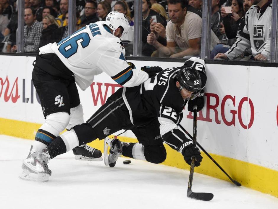 AP photo: San Jose Sharks Roman Polak left battles for the puck with the Los Angeles Kings Trevor Lewis right in the second period on Saturday night in game two at Staples Center