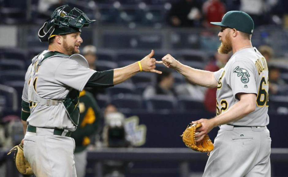 AP photo: Oakland A’s pitcher Sean Doolittle gets the save and is congratulated by A’s catcher Stephen Vogt in the A’s second win in the three game series in Yankee Stadium Wednesday night