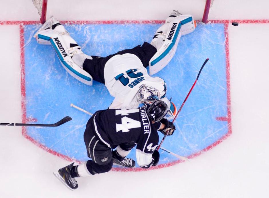 It wasn’t the Sharks’ first shot of the game but the second worked just as well, 1:08 into the game. After crossing the blue line, Couture passed to Donskoi, who scored from the right faceoff circle, with a hopping Couture avoiding the puck in front of goalie Jonathan Quick. It was Donskoi’s second point of the playoffs, with an assist in Game 1.