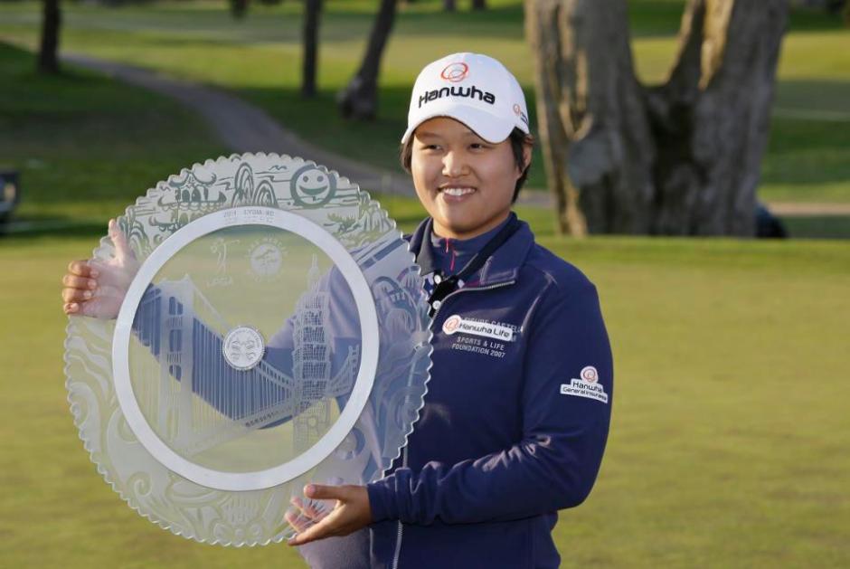 AP photo: Haru Nomura holds up the LPGA Swinging Skirts 2016 Trophy at the 18th hole at Lake Merced Golf Club after winning the tournament