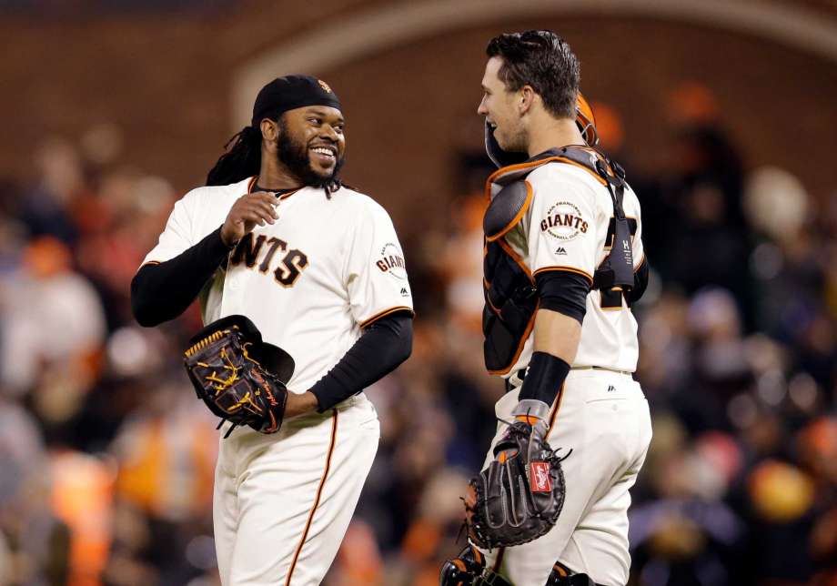 AP photo: Johnny Cueto and catcher Buster Posey are all smiles after Cueto shutouts the San Diego Padres 1-0 Tuesday night