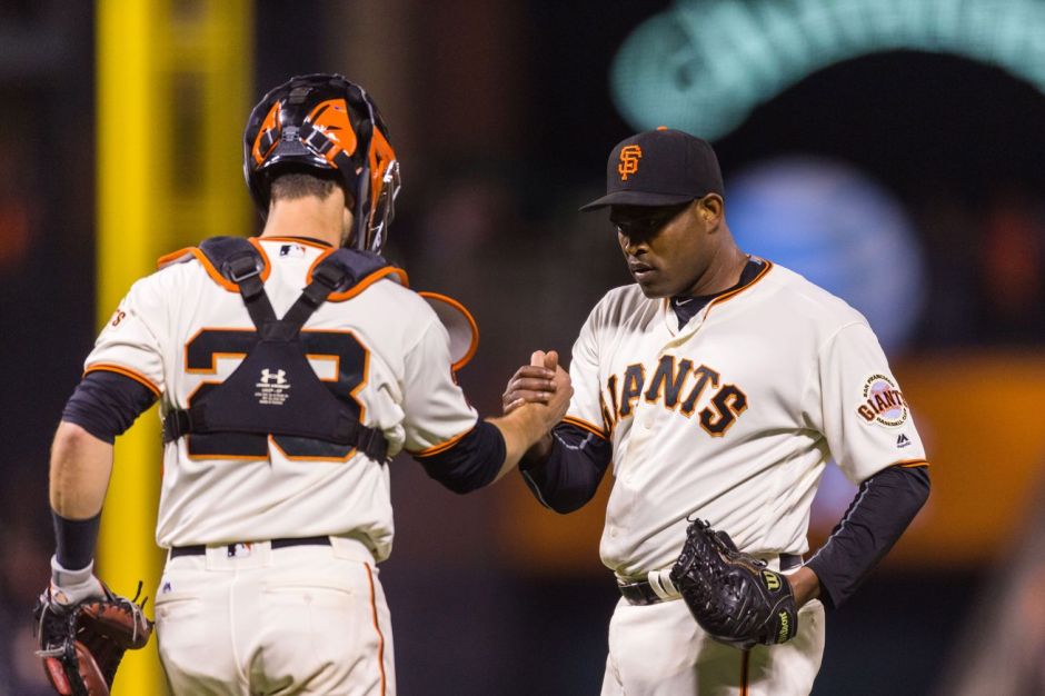 USA Today photo: San Francisco Giants pitcher Santiago Casilla is congratulated by Giants catch Buster Posey