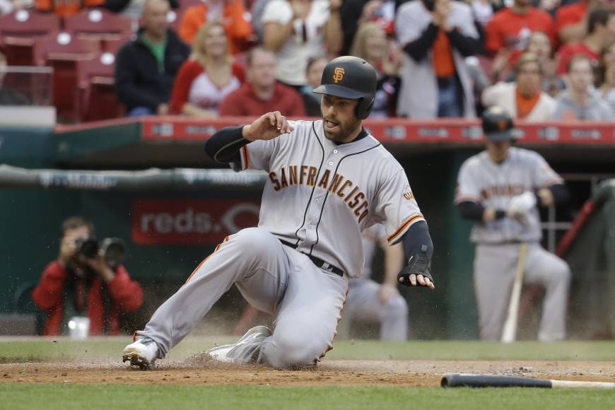 AP photo: SF Giants Mac Williamson slides in to score in the second inning of Monday night’s game vs. Reds