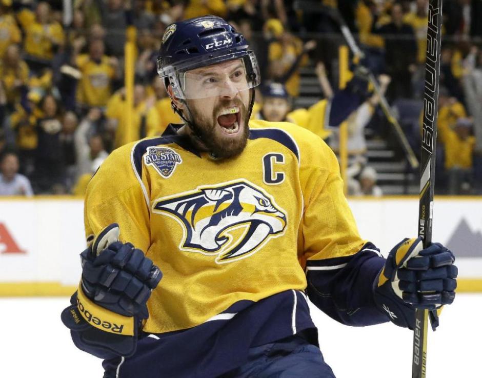 AP photo: Nashville Predators Shea Weber celebrates after scoring in the second period against San Jose Sharks