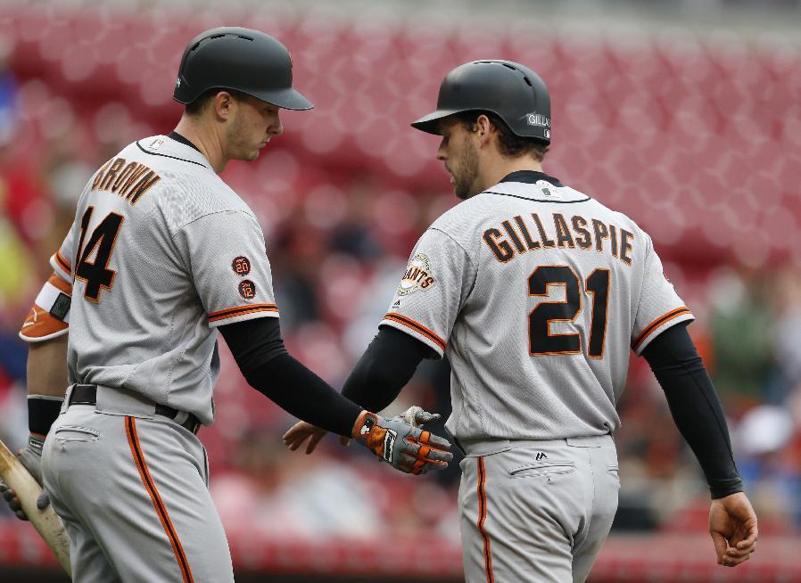 AP photo: The San Francisco Giants Connor Gillaspie 21 gets congratulated by Trevor Brown 14 after hitting a home run off Reds pitcher Dan Straily in the fourth inning in Cincinnati