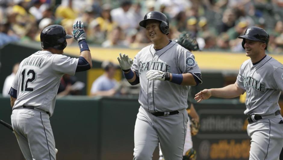 AP photo: The Seattle Mariners Dae-Ho Lee is congratulated by teammates Leonys Martin (12) and right Kyle Seager after hitting a two run home run in the seventh inning off A’s pitcher John Axford
