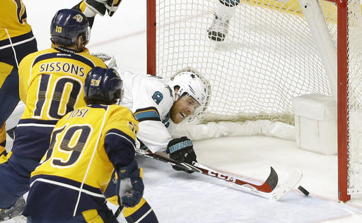 Nashville’s Mattias Ekholm shot the puck at goalie Martin Jones. Fisher then corralled the loose puck, as he maneuvered his way around the front of Jones to score.