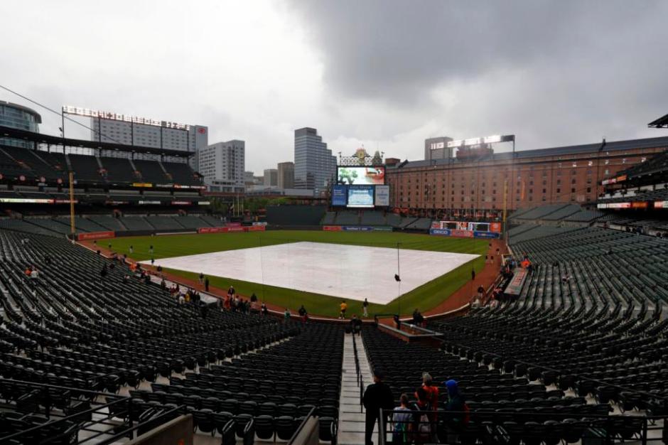 photo credit AP: The tarp was out at Camden Yards on Friday night as the field was covered as the game between Oakland and Baltimore was called due to rain