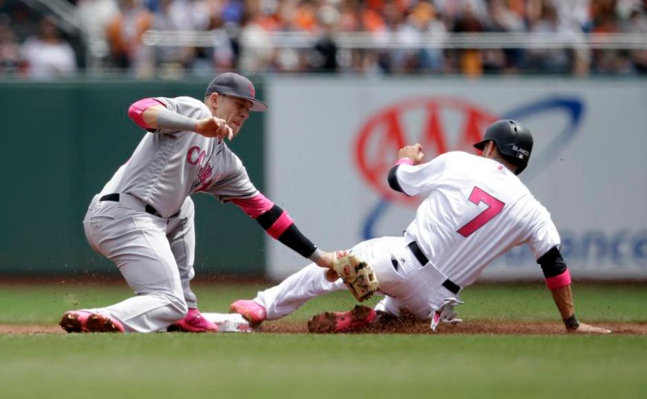 AP photo: San Francisco Giants Gregor Blanco steals second on the Colorado Rockies Trevor Story in the first inning of Sunday’s game at AT&T Park