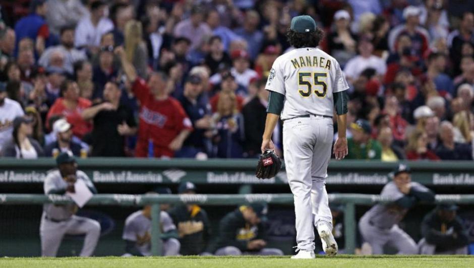 AP photo: Oakland A’s starter Sean Manaea heads to the dugout after being lifted in he third inning of Tuesday night’s game at Fenway Park
