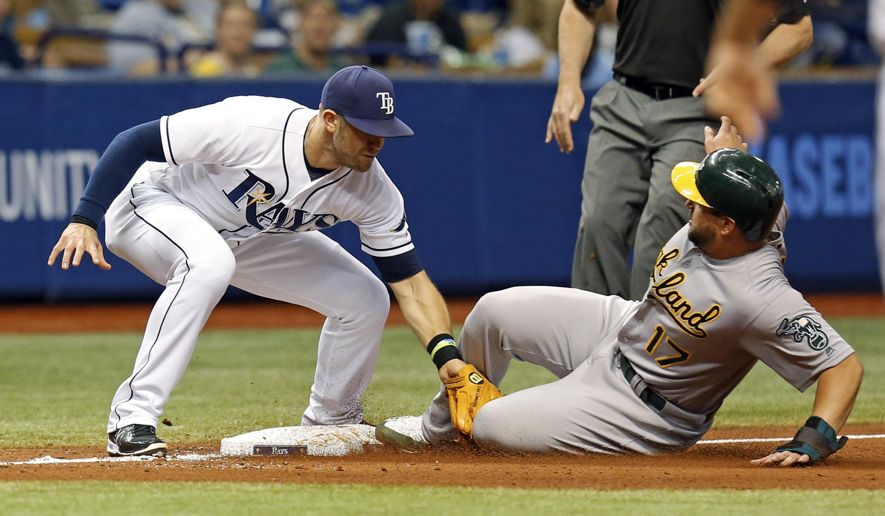 AP photo: Oakland A’s Yonder Alonso slides ahead of Tampa Bay Rays third baseman Evan Longoria’s tag in the sixth inning at Tropicana Field on Friday