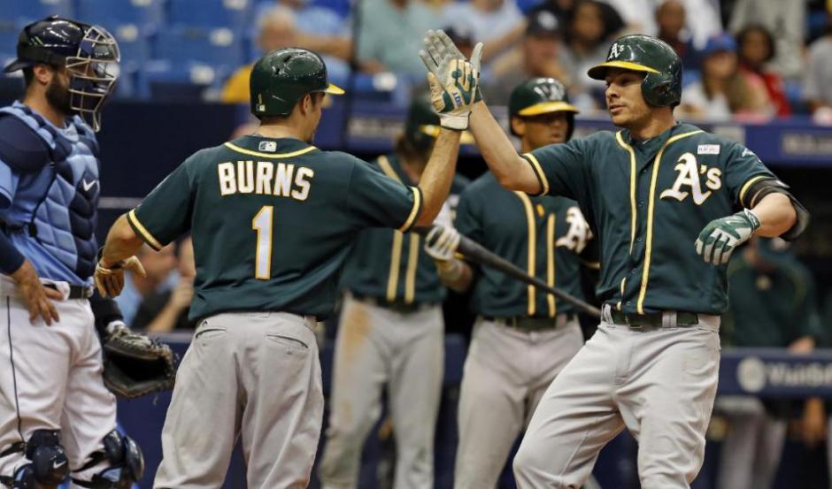 AP photo: Oakland A’s Danny Valencia gets congratulated by the A’s Billy Butler after hitting his third home run of the game against the Tampa Bay as the Rays catcher Curt Casali waits for the celebration to end
